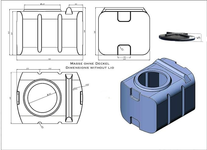 - Features: colour: blue, length: 79 cm, width: 61 cm, height: 57 cm without lid (59 cm with lid) inspection hatch: diameter 35 cm, wall thickness: 3.5 mm, connections 1 x 3/4 inch, the water tank is intended for stationary use